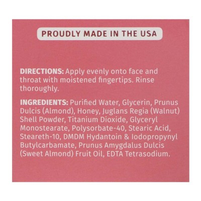 물, 소듐 코코 일 이세 티오 네이트, 코코 베타 인, 글리세린, PEG-50 시어 버터, 알로에 베라, 알란토인, 전체 식품 추출물 블렌드 (복숭아, 옐로우 스쿼시, 멜론, 빨강 및 녹색 고추, 토마토, 오렌지, 레몬, 셀러리, 자몽, 적 포도, 딸기, 브로콜리, 배, 머스타드 그린, 콜리 플라워, 브뤼셀 콩나물, 이제 ... 기본 페이셜 스크럽을 개선하여 더 많은 꿀로 부드러운 스크럽을 만들어 모든 피부 타입에 깊은 모공 클렌징을 제공합니다.